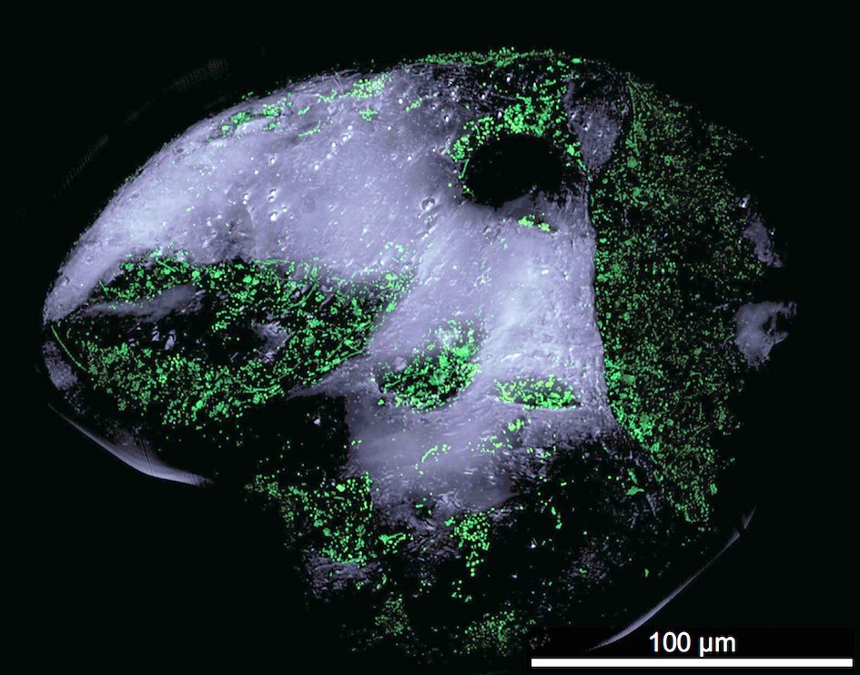 Figure: Colonisation of a grain of sand with microbes (coloured green), © Probandt et al. (2017) Use according to CC 4.0,