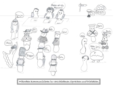 Mikroben kommunizieren miteinander. Wir Menschen können diese Sprache zwar nicht hören, erleben aber zum Teil die Auswirkungen dieser Kommunikation: So wachsen manche Bakterien nach „Absprache“ in geschützten Zellanhäufungen, den Biofilmen, die wir als schleimige Beläge (auf Dichtungen oder in Einspülkammern der Waschmaschine) kennen. Bakterien benutzen für ihre Unterhaltung kleine chemische Moleküle. So erfassen sie, wie viele und welche Nachbarn in ihrer Umgebung sind. Ist ein gewisser Schwellenwert an chemischen Molekülen - ein Quorum - erreicht, aktivieren sie ein bestimmtes Verhalten, beispielsweise die Leuchtfähigeit (Biolumineszenz) oder eben die Bildung von Biofilmen. Daher wird die Sprache der Bakterien auch als Quorum sensing („Messen einer Anzahl“) bezeichnet. Die Sprache der Mikroben ist so vielfältig wie die menschliche. Es existieren verschiedene Sprachen - also chemische Moleküle - vergleichbar den unterschiedlichen Landessprachen. Innerhalb einer Landessprache gibt es zudem diverse Dialekte, also verschiedene strukturelle Varianten eines Signalmoleküls. In einer Mikrobengemeinschaft gibt es Bakterien, die sowohl sprechen als auch zuhören können und solche, die nur zuhören, aber selbst nicht sprechen und sich somit innerhalb der Gemeinschaft verstecken. Jede Bakterienart beherrscht unterschiedlich viele Sprachen. Durch Kommunikation treten Mikroben ähnlich wie wir Menschen miteinander in Beziehung und teilen sich so ihre Handlungsabsichten mit.