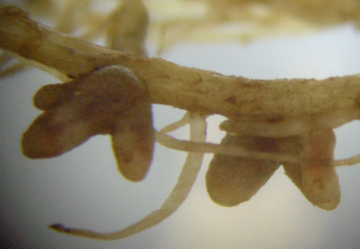 Die Landwirtschaft nutzt diese Wechselwirkung: Der Anbau von Leguminosen auf landwirtschaftlichen Flächen führt dem Boden Stickstoff zu, der in der folgenden Saison anderen dort angebauten Pflanzen zur Verfügung steht. Diese Symbiose beruht auf einem festgelegten Schema: Beide Partner erkennen sich wechselseitig durch Komponenten auf ihren Oberflächen. Die Rhizobien heften sich an die Wurzelhaare der Pflanze und bewirken, dass diese sich einkrümmen. Daraufhin dringen die Bakterien in die Pflanze ein und bilden einen Schlauch. An dessen Spitze entsteht ein neues Organ, der Bakteroid (siehe Abbildung). Dort arbeitet das Enzym, das den Stickstoff umsetzt. Diese Nitrogenase ist sehr sauerstoffempfindlich. Daher sorgt ein weiteres Enzym, das Leghämoglobin, für eine niedrige Sauerstoffkonzentration. Leghämoglobin ist wie unser damit verwandter Blutfarbstoff Hämoglobin rot gefärbt. Wird der Gehalt an Sauerstoff zu gering, kann das Leghämoglobin diesen auch wieder freigeben. Somit erfüllt es die gleiche Aufgabe wie das Hämoglobin im menschlichen Blut: die Bindung und Freisetzung von Sauerstoff. Allerdings bindet das Leghämoglobin Sauerstoff zehnmal stärker als das Hämoglobin im menschlichen Blut, wodurch im Wurzelknöllchen viel weniger Sauerstoff übrig bleibt.