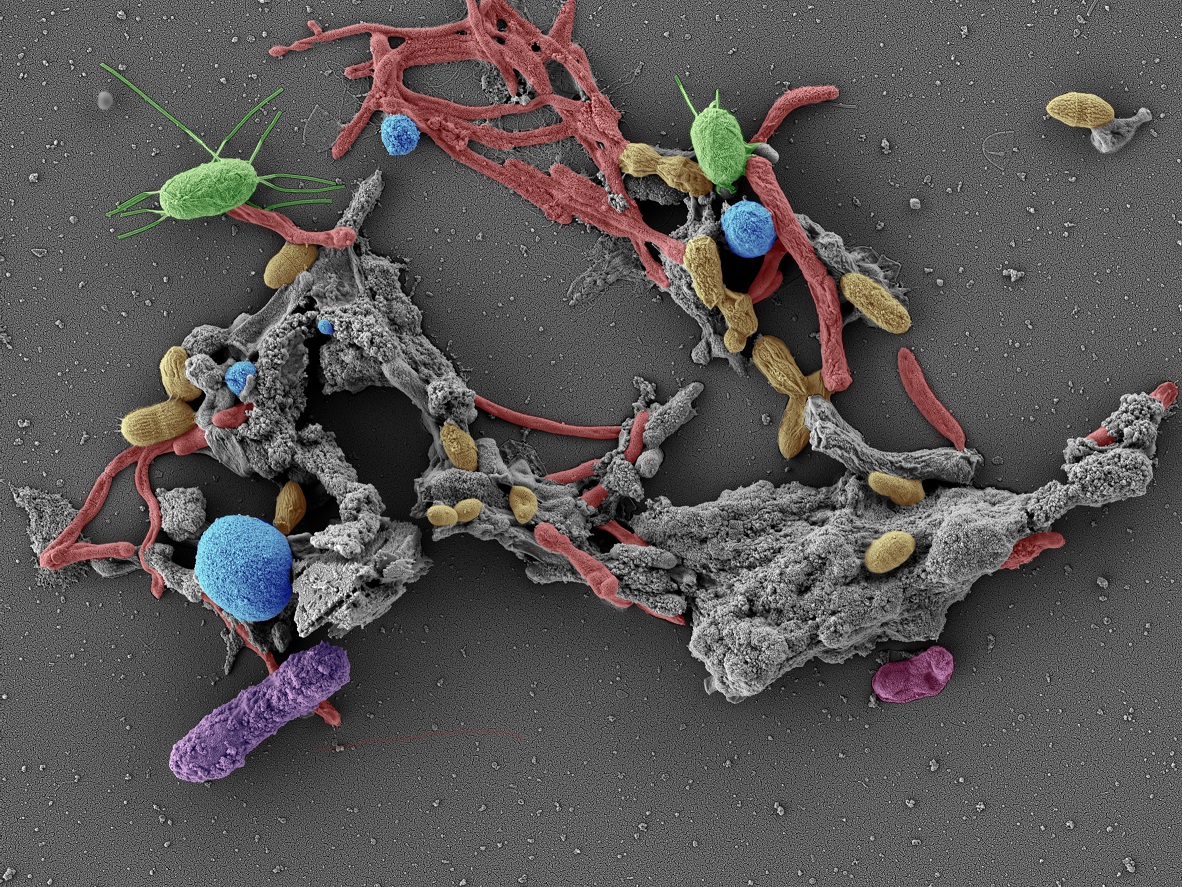 Abbildung: Darmmikrobiom - kolorierte elektronenmikroskopische Aufnahme einer Stuhlprobe